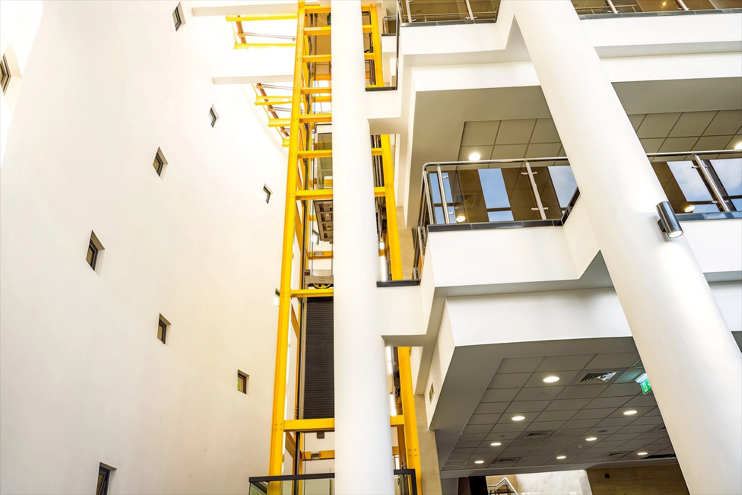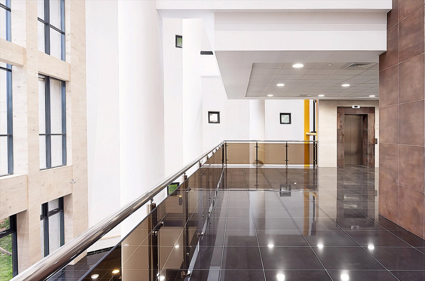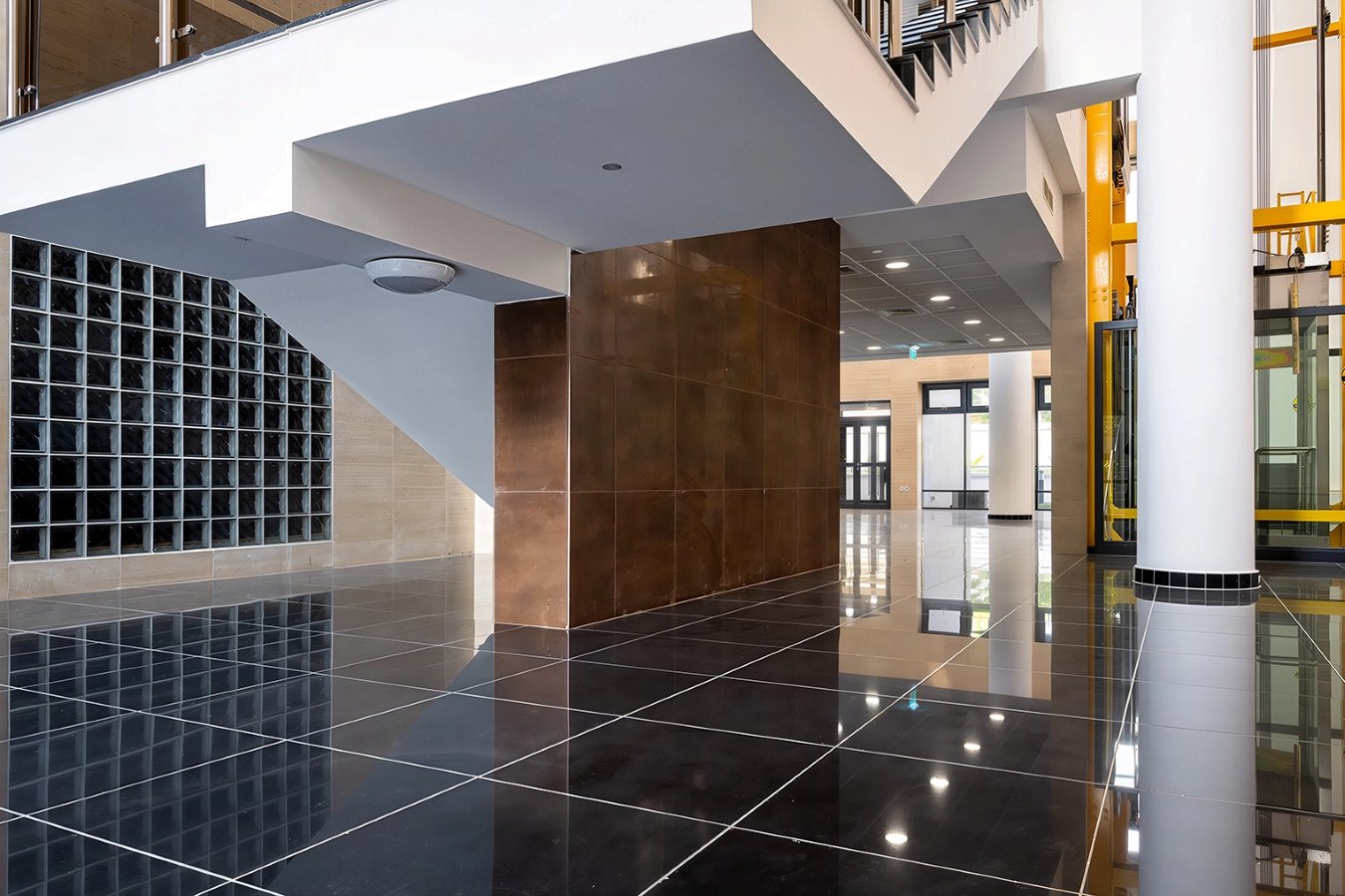 At the heart of the project, a tall internal atrium organizes circulation across multiple levels. Bridges, balconies, and vertical movement systems are expressed openly within this volume, turning circulation into a spatial experience rather than a concealed necessity. Daylight filters down from above, animating the polished floors and stone surfaces throughout the day.