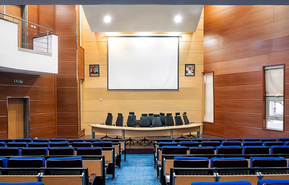 Inside, material choices reinforce durability and calm. Marble-lined walls, generous glazing, and double-height volumes create interiors that feel formal yet breathable. The exam hall itself is designed with acoustic control, clear sightlines, and a disciplined layout that supports concentration and order.