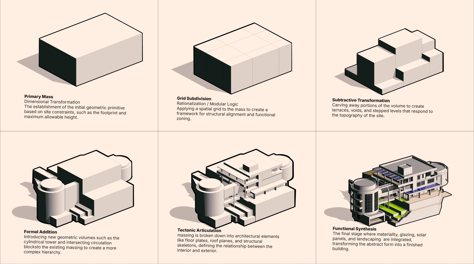 Responding directly to the site’s steep topography, the building is organised as a split-level composition, with two levels carefully embedded below the grid, while the main entrance is resolved at Level 03. This strategy minimises visual intrusion on the skyline, enhances thermal performance, and allows the architecture to emerge organically from the terrain rather than dominate it. Circulation, structure, and spatial sequencing are all shaped by this sectional logic, resulting in a dynamic internal experience that unfolds gradually as one moves through the building.