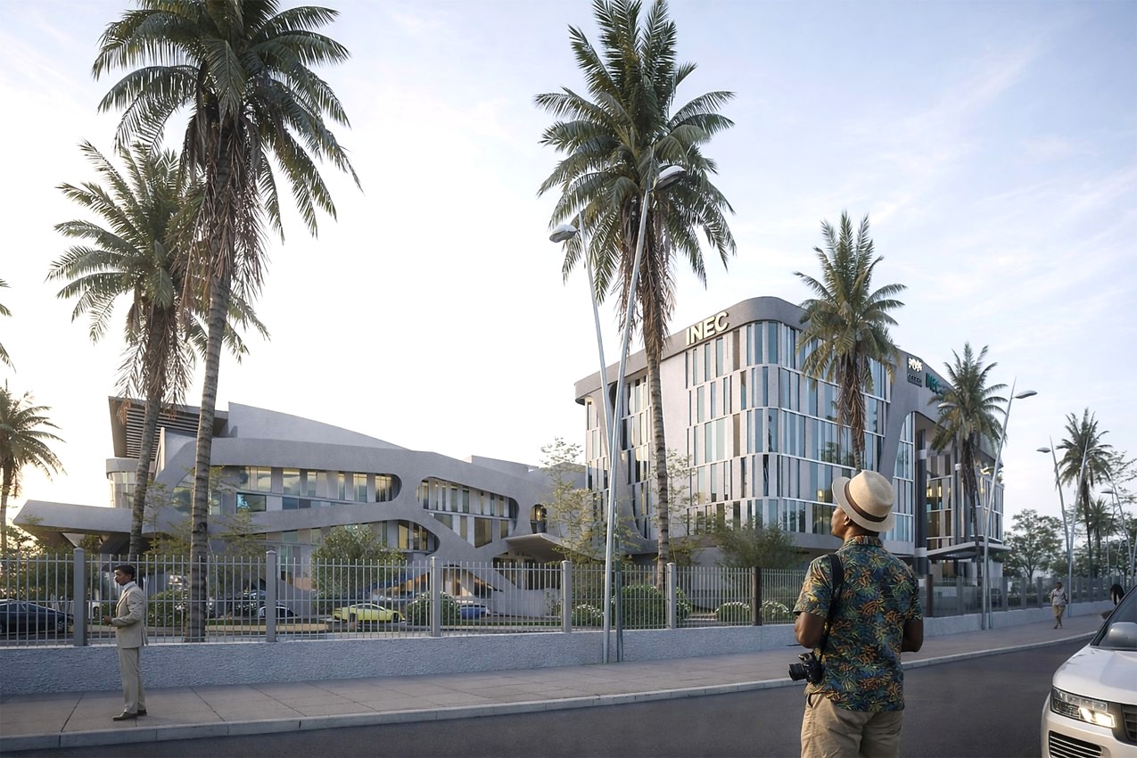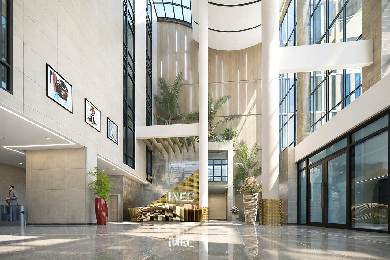 The INEC Headquarters Annex is conceived as a contemporary civic landmark, an architecture that expresses transparency, resilience and institutional integrity. Positioned to complete the eastern edge of Aguiyi Ironsi Street in Maitama, the building strengthens the urban fabric while establishing a clear civic presence. Its form is composed as an H-shaped configuration organised around a multi-storey, light-filled atrium, the symbolic and spatial heart of the institution. Open to the south, the fully glazed atrium draws natural light deep into the building and creates a visible expression of openness. Landscaped terraces, green walls, and vertical circulation animate this internal civic forum, dissolving the boundary between interior and exterior.