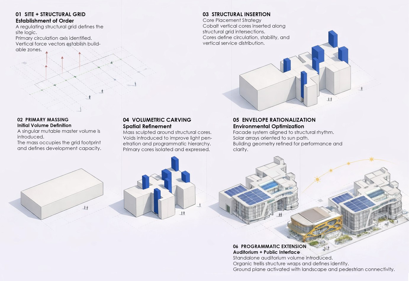 Spatial Clarity & Institutional Order - The building separates public, staff and VIP access points, ensuring operational clarity while maintaining a dignified and welcoming civic threshold. A detached north-facing service core consolidates lifts, staircases and technical risers, freeing the primary volumes for highly adaptable office environments. Flexible floor plates are structured on a rational 10.8m grid, enabling future reconfiguration as institutional needs evolve.