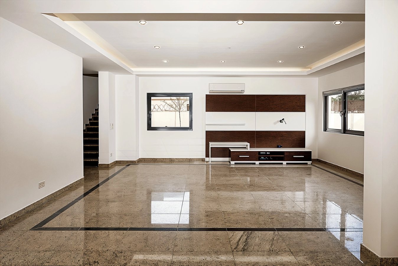 Inside, the home prioritizes openness and functionality. Large, tiled floors, neutral walls, and recessed ceilings provide a flexible backdrop for everyday living. Living areas are spacious and uncluttered, allowing furniture and activity to define the character of each space rather than excessive architectural detailing.
