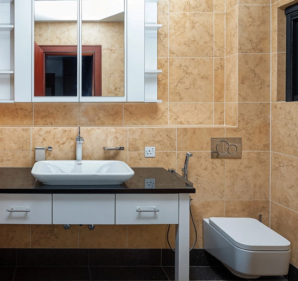 The kitchen and service areas continue this philosophy through efficient layouts and durable finishes. Clean cabinetry lines, integrated appliances, and contrasting textures of wood and tile create a modern yet practical working environment suited to daily use. Bathrooms and circulation areas maintain the same level of refinement with contemporary fixtures, wall-hung elements, and coordinated finishes. Throughout the residence, materials are selected for durability, ease of maintenance, and visual consistency.