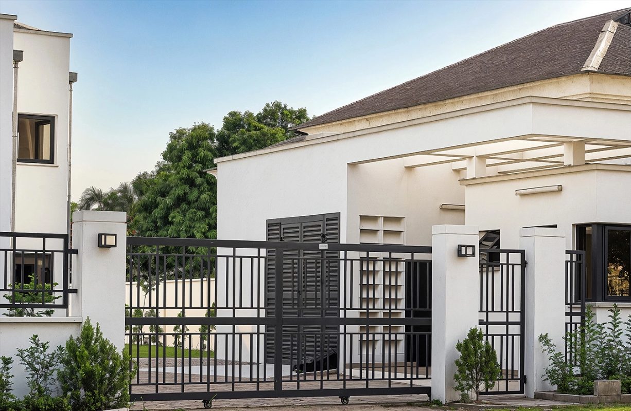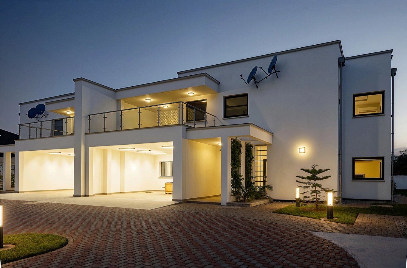 The front façade is composed of layered planes and recessed elements that provide depth while maintaining a minimalist expression. Balconies with glass railings, shaded entry points, and carefully positioned openings give the building a light, breathable character suited to its climate and residential setting. The paved forecourt and secure perimeter fencing reinforce both accessibility and privacy.