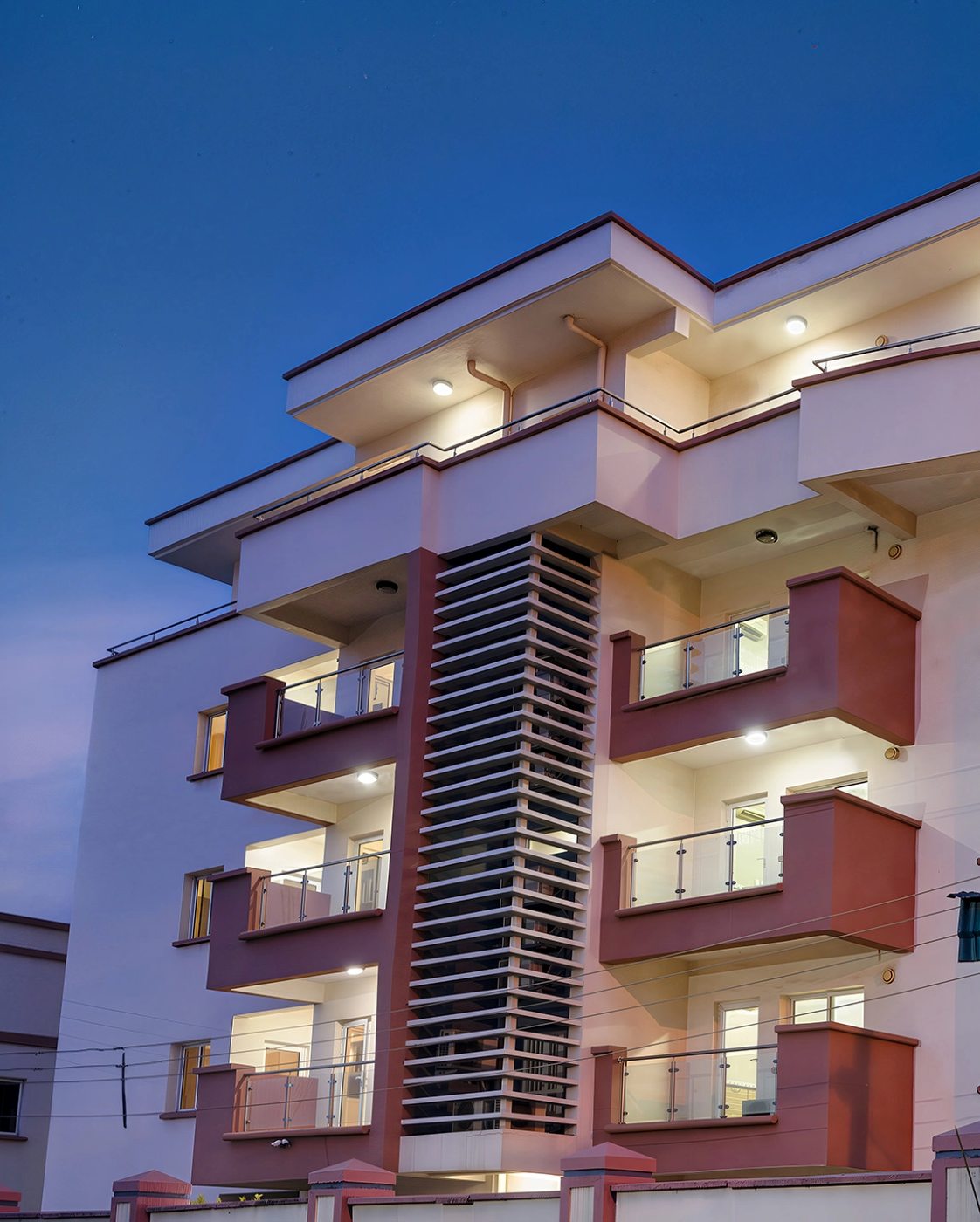 Sa’ara Isowo Court is conceived as a calm, ordered residential enclave where repetition and rhythm create a strong visual identity. The massing is disciplined and symmetrical, using stacked balconies, framed openings, and a central vertical core to give the building a clear architectural cadence. This repetition is not monotonous; subtle shifts in projection, color, and depth give the façade life while maintaining composure.