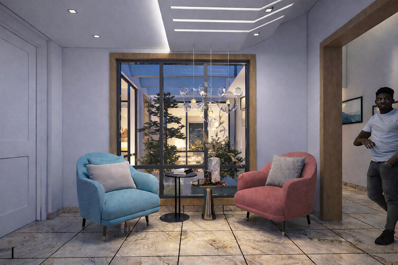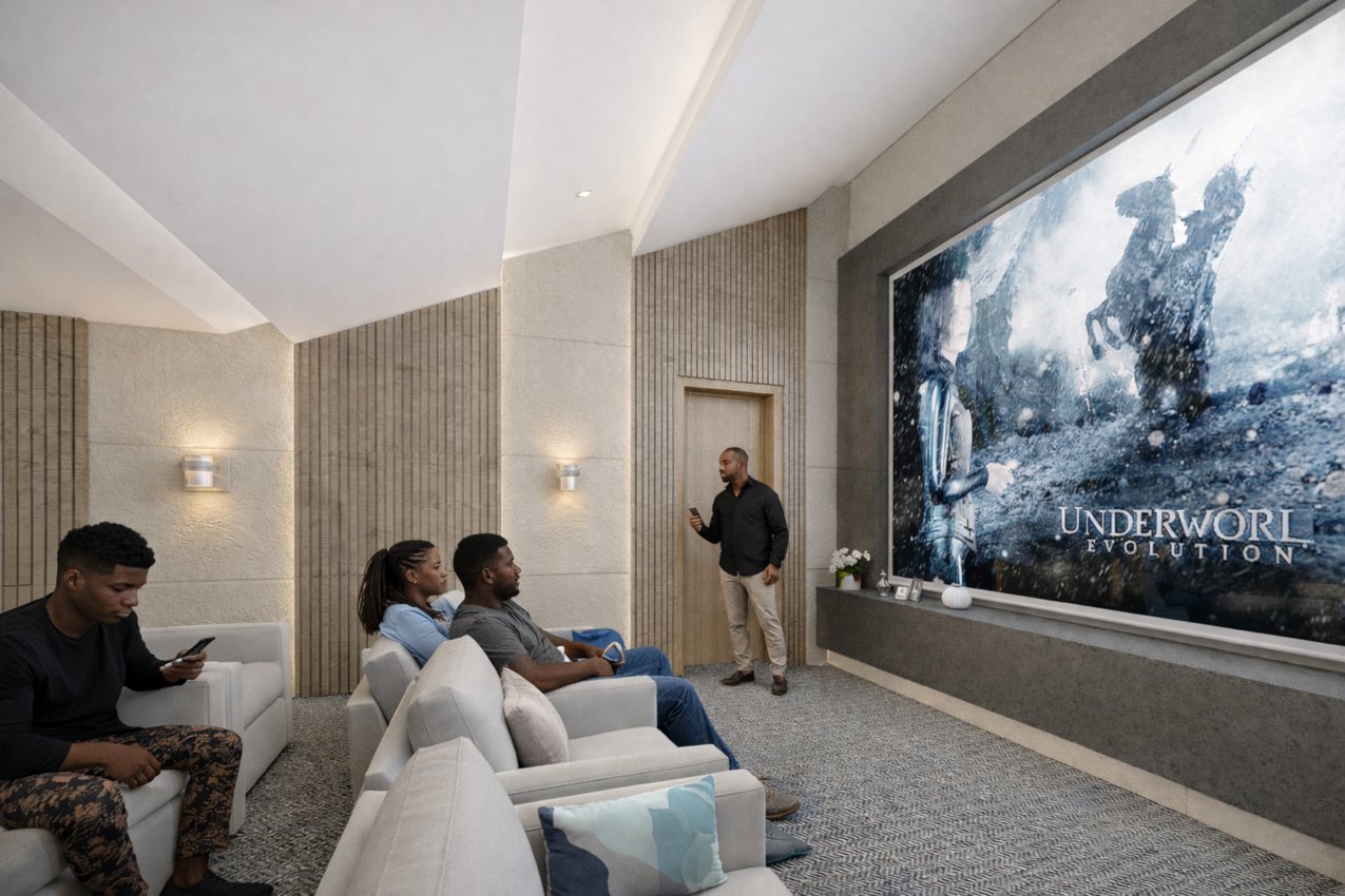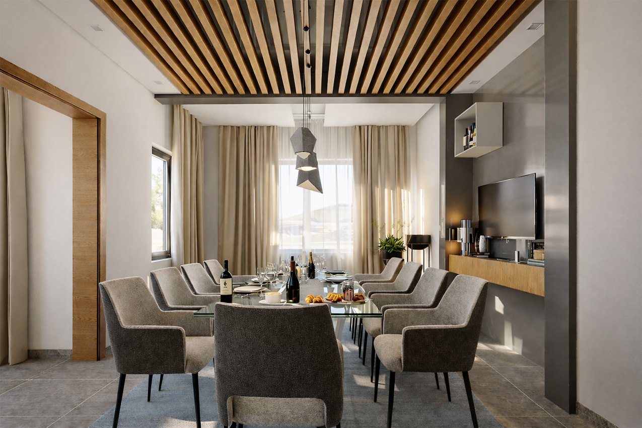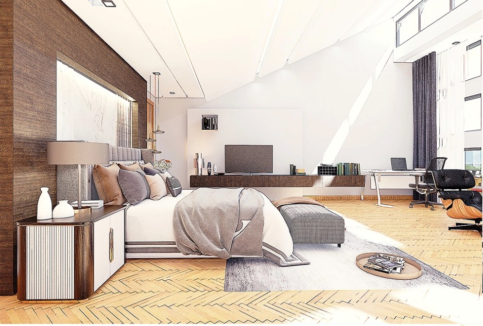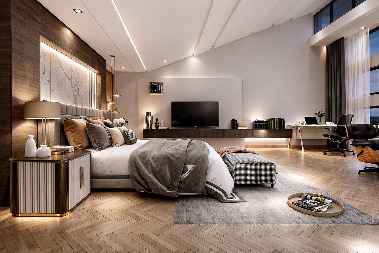 Private spaces such as bedrooms and bathrooms maintain this design language through warm textures, soft lighting, and thoughtful proportions. Materials including wood accents, stone surfaces, and large-format tiles provide durability while contributing to a refined residential character.