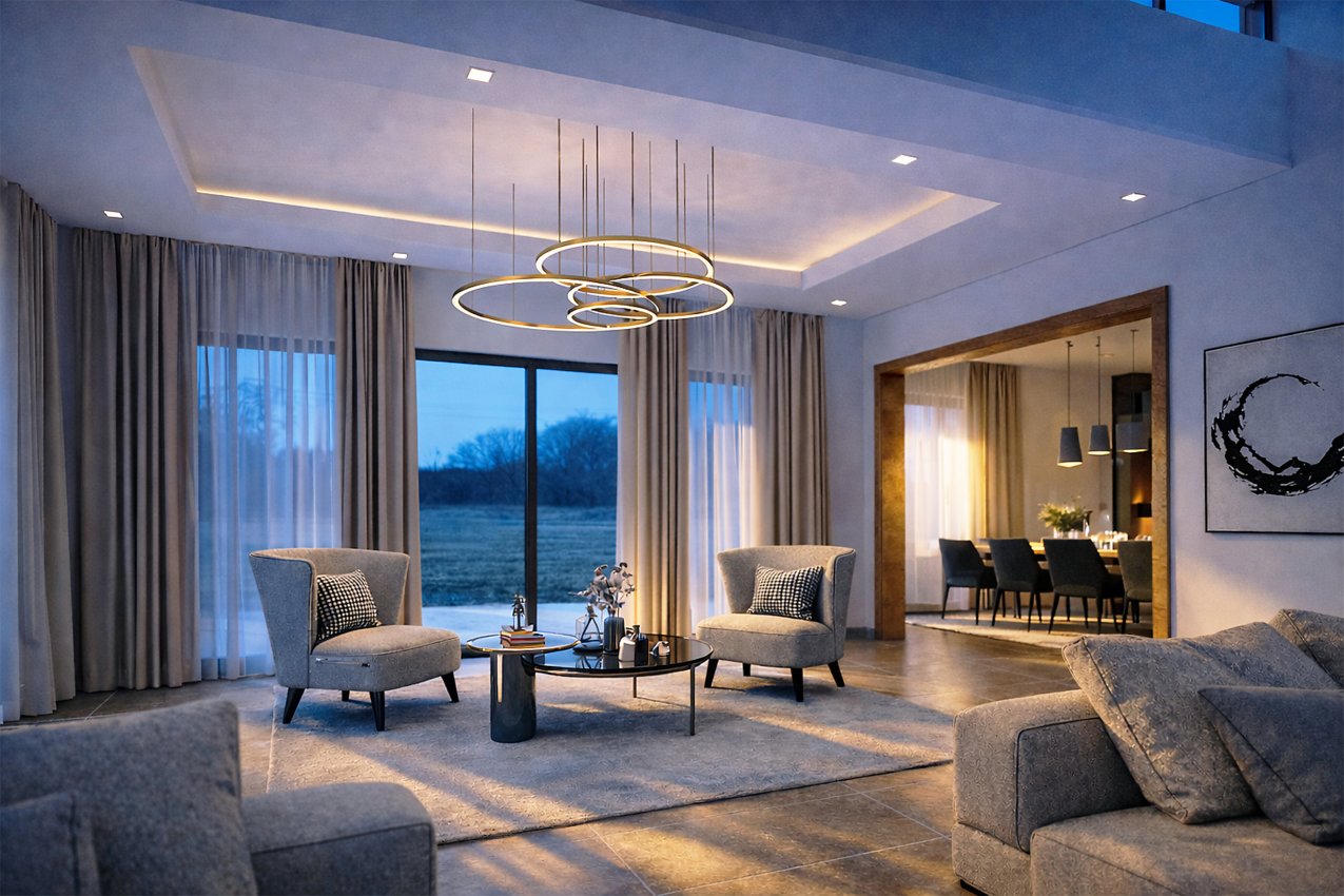 Internally, the spatial experience is defined by volume and light. Living areas benefit from higher ceilings and controlled daylight from above, creating an atmosphere that feels open yet intimate. Clean lines, restrained material palettes, and integrated detailing reinforce a sense of calm continuity throughout the home.